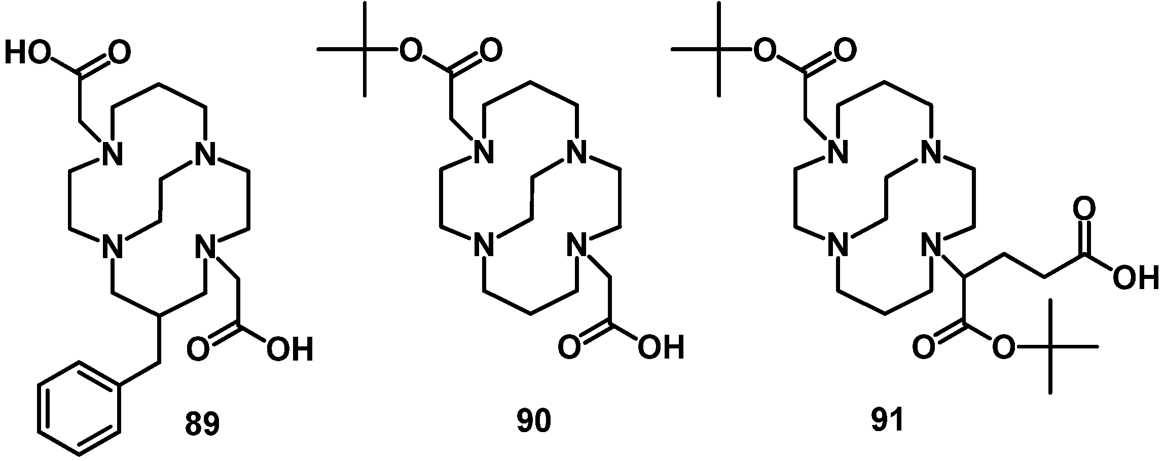 The synthesis of DOTA first reported by Stetter and Frank in 1976 [106] involved the reaction of cyclen 50 with chloroacetic acid under aqueous alkaline conditions (Scheme 4, path a). DOTA (28) is the most efficient chelator for both diagnostic and therapeutic applications in nuclear medicine, due to the high kinetic stability of its complexes. In oncology, major progress has been achieved using DOTA-ligands for the preparation of contrast agents for magnetic resonance imaging (MRI). In addition, the contrast agents based on macrocyclic chelators ensure that the Gd-complexes are, when compared to the corresponding complex of DTPA, kinetically more inert. DOTA also is the favorable BFCA for the preparation of therapeutic lanthanide radiopharmaceuticals [91]. Besides, it forms very stable complexes with divalent and trivalent radionuclides like 67/68Ga, 111In, 86/90Y and 64/67Cu [86,107,108,109,110,111,112,113]. Several different species of DOTA-based bifunctional chelators have been described for attaching the DOTA-unit to biomolecules: protected DOTA forms, active DOTA esters and DOTA-derivatives with a coupling moiety that was introduced into the macrocycle or at the α-position of one carboxylate arm. Due to the high efficiency of the conjugation methods available protected forms and active esters are suitable for use in solid phase peptide synthesis. The use of these synthons leads to DOTA monoamides for the coordination of radiometals. This leads to a decreased thermodynamic stability constant, but the kinetic inertness in vivo is not changed compared to DOTA.