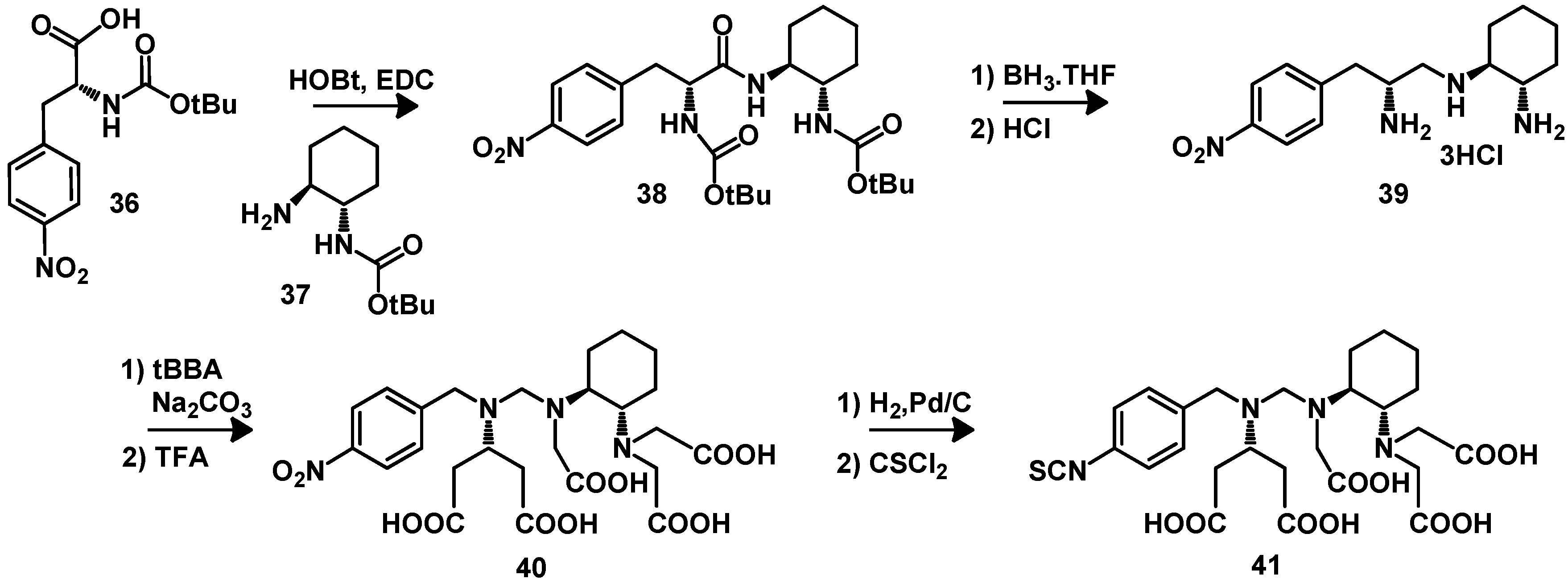 [111In]-DTPA-octreotide (OctreoScan®) is an octreotide derived somatostatin analog known to act as a selective molecular targeting agent for the imaging of neuroendocrine tumors. It has been widely used as imaging agent in single photon emission computer tomography (SPECT). DTPA (diethylenetriaminopentaacetic acid, 27) was first synthesized by Frost [88]. DTPA and its derivatives (Figure 7) can be used for the complexation of radiometals like 111In, 213Bi, 86/90Y, 177Lu, 99mTc, 67/68Ga for nuclear medicine applications and for Gd for MRT applications. The conjugation of DATP using its reactive mixed anhydride [89] or cyclic bisanhydride 32 [90] can lead to undesired conjugates, in particular double substituted DTPA side products [91]. To avoid this drawback, DTPA-tetra(t-Bu ester) (33) or DTPA-tetra(All ester) (34) have been synthesized starting from diethylenetriamine [92,93]. The activation of the free carboxylic group with activation agents like DIC or HBTU allows the defined conjugation with primary amines of proteins or peptides. A major advantage of using 33 is its commercial availability and that it readily reacts in solid phase synthesis reactions. In addition, this BFCA shows a fast labeling kinetic and thus the reaction conditions for radiometallation can be applied for sensitive biomolecules. Unfortunately, in contrast to the radionuclide 111In, most of the commonly applied β-emitters do not form complexes with sufficient kinetic stability for radiotherapy [84]. DTPA derivatives bearing a functional isothiocyanate group like 35 were synthesized to allow selective conjugation of an amino group of a protein under mild reaction conditions. In these conjugates all carboxylic arms are available for coordination to the radiometal. The geometry of the coordination sphere can be optimized by introducing a preorganizing group on the DTPA backbone [94,95,96]. The ligands obtained can be conjugated to biomolecules and form radionuclide complexes with greater kinetic stability in vivo and faster complexation kinetic. These DTPA derivatives are viable alternatives to DOTA for radiometallation of monoclonal antibodies [97,98,99] or for labeling with short half-live isotopes like bismuth-212 and bismuth-213 [97]. CHX-A''-DTPA (41) has to be considered as a suitable BFCA for the radiolabeling of monoclonal antibodies with β-emitters for radioimmunotherapeutical applications. Scheme 1 includes the synthesis of CHX-A''-DTPA. The first FDA-approved therapeutic agent for treatment of patients with lymphoma was ibritumomab tiuxetan (Zevalin®, Cell Therapeutics Inc, Seattle, WA, and Schering AG, Berlin, Germany). It is labeled with 90Y using an acyclic DTPA based BFCA.