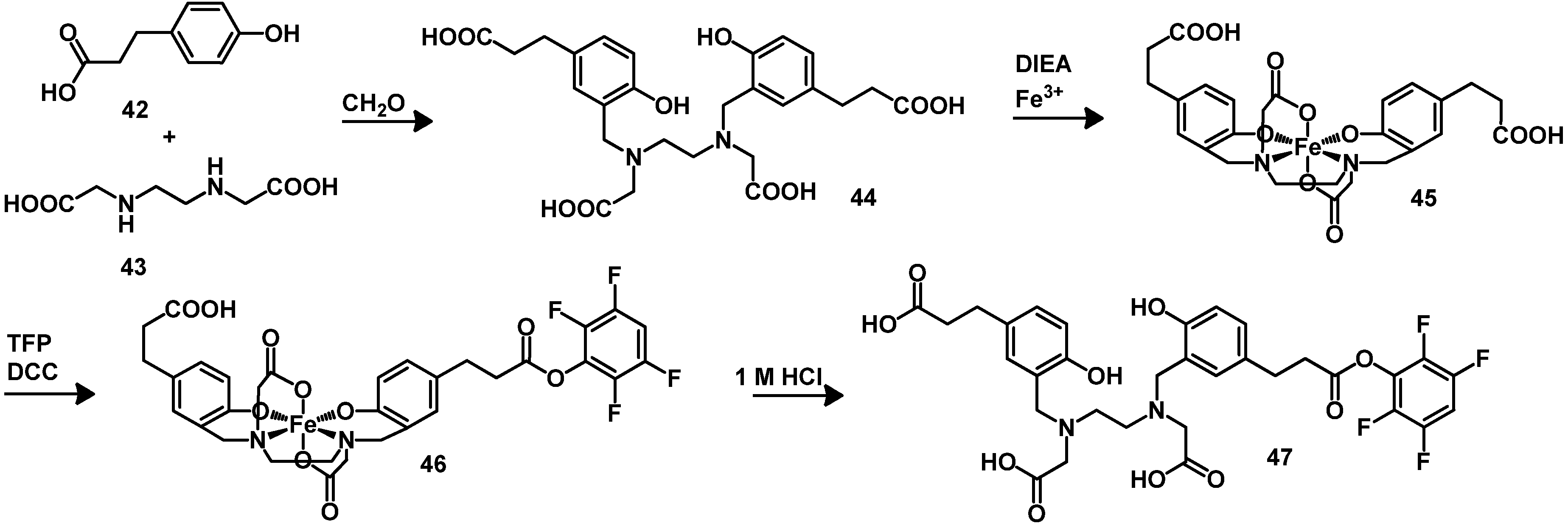 Among the variety of potential acyclic BFCAs, HBED (N,N′-bis[2-hydroxybenzyl]ethylenediamine-N,N′-diacetic acid)-based ligands have been used for the radiometallation of biomolecules [100,101]. HBED-CC (N,N′-bis[2-hydroxy-5-carboxylethyl-benzyl]ethylenediamine-N,N′-diacetic acid, 44) forms complexes with 68Ga with high in vivo stability. The use of HBED-CC as BFCA is similar to the method for producing 68Ga-radiolabeled proteins with fast complexation kinetics at ambient temperature that can be used as diagnostic agent, e.g., for positron emission tomography (PET) imaging [102]. For this aim the (HBED-CC)TFP active ester 47 has been described and synthesized by activating one of the two carboxyl groups of the [Fe(HBED-CC)]−complex with DCC and tetrafluorophenol in DMF. The demetallation can be performed with 1 M HCl (Scheme 2).