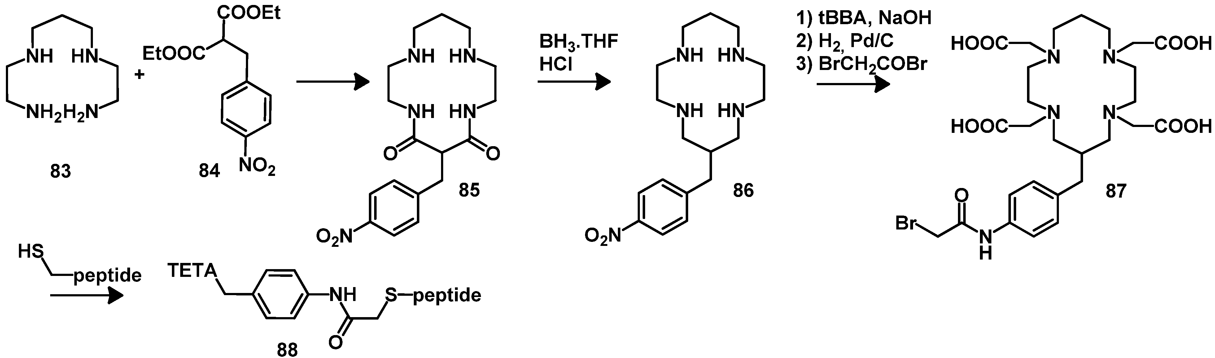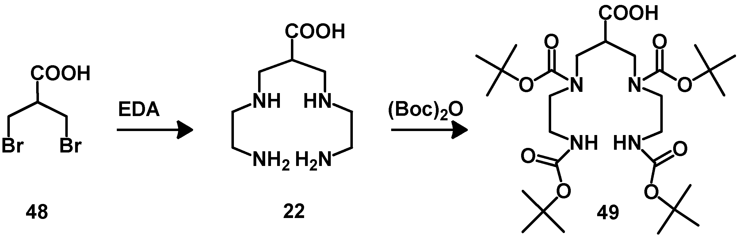 Acyclic BFCAs have also been used for the labeling of biomolecules with 99mTc. Recently, it was found that tetraamine-based ligands show superiority to all the other chelators for 99mTc, with whom the labeling reaction can be performed at RT. They were also shown to form central and hydrophilic 99mTc-complex with high kinetic inertness, as well as improved pharmacokinetic including fast blood clearance and specific tumor uptake [70,71,72,73,74,75]. The synthesis of the N4-chelator 49 has been facilitated by the reaction of 3-bromo-2(bromoethyl)propionic acid with ethylenediamine (Scheme 3). The protection of the resulting intermediate with Boc protecting groups allows the conjugation with primary amines of peptides on solid phase [76].