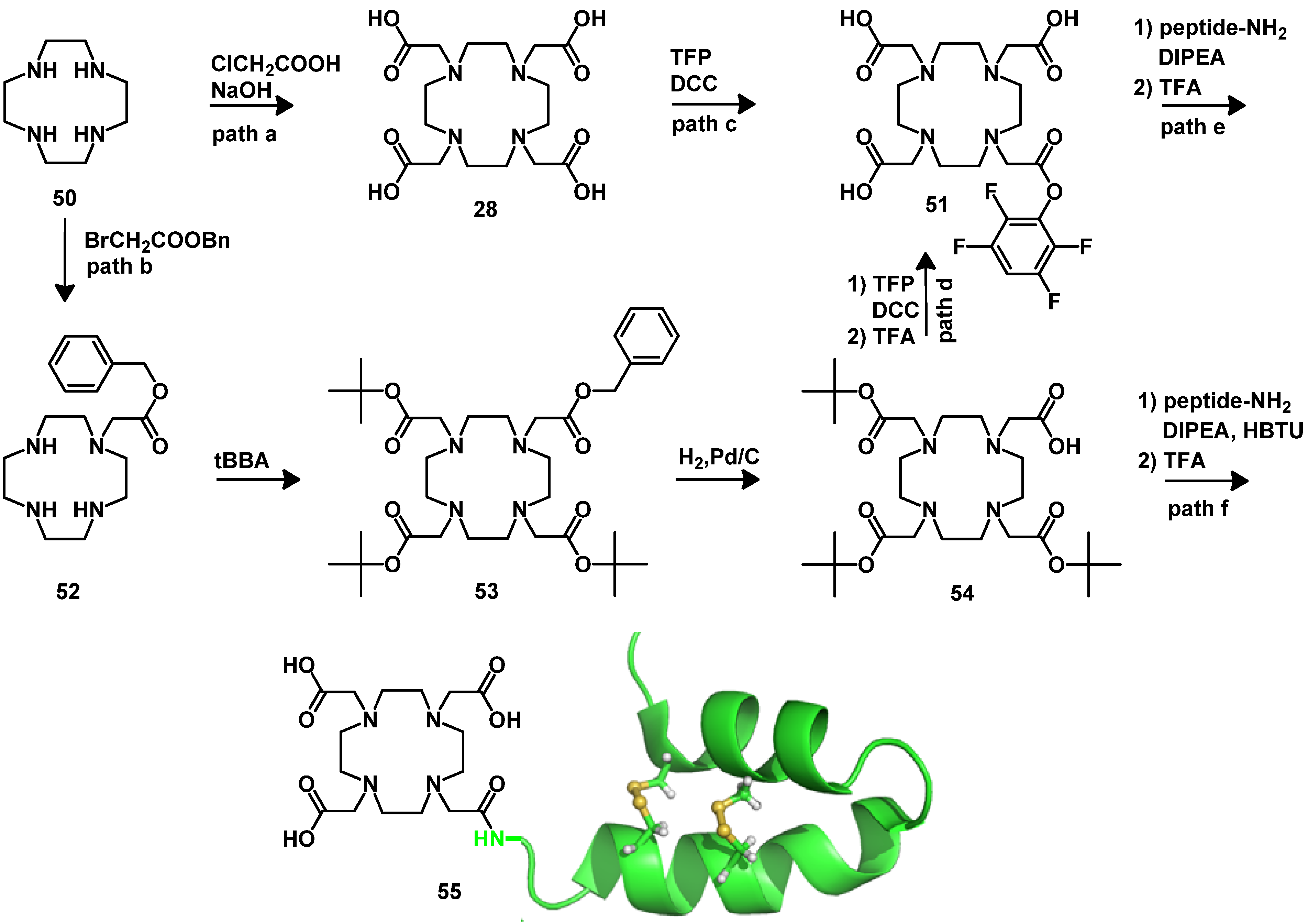 DOTA active esters have been established for the labeling of proteins. The approach is based on the activation of one of the carboxylic groups. Different activated DOTA esters have been synthesized to optimize the synthesis of DOTA-conjugated biomolecules: (a) mixed anhydride derivative which was prepared using isobutyl chloroformate in the presence of TMG [89]; (b) the active ester DOTA-NHS obtained by direct activation with NHS and EDCI in a water-DMF mixture and followed conjugation to protected peptide [114] and (c) DOTA-phenolic active esters [115]. The class (c) constitutes the favorable precursors, allowing selective conjugation in high yields without the formation of double substituted DOTA side products. In addition, the phenolic esters can be varied that the hydrolytic stability is adopted for the respective application. DOTA-phenolic active esters, such as DOTA-TFP (51), can be prepared starting from DOTA or DOTA-tris(t-Bu ester) (54) by esterification of one carboxylic group using DCC or DIC and the corresponding phenol in a water-acetonitrile mixture (Scheme 4, paths c and d), offering a BFCAs with comparable reactivity to BOP- and HBTU-style reagents [116] which can react with amino groups of peptides or proteins (Scheme 4, path e).