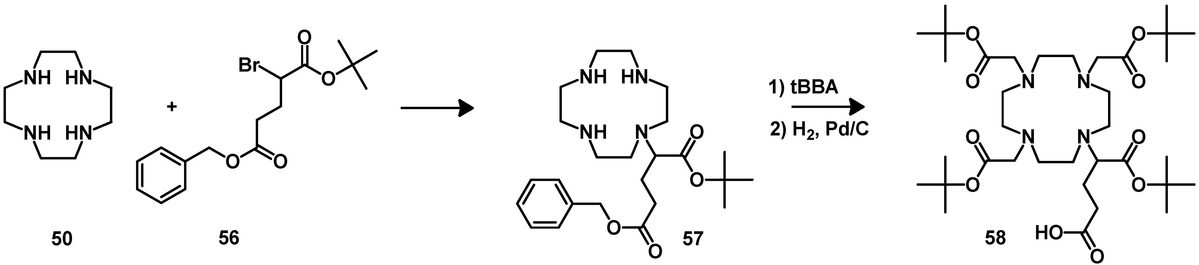 Different synthetic approaches have been followed to improve the synthesis of DOTA-tris(t-Bu ester) (54), the synthesis of DO3A-tris(t-Bu ester) [123,124] and the total solid-phase synthesis of the DOTA chelator on solid support [125]. The synthesis can be achieved by the procedure described by Mäcke [126,127] (Scheme 4, path b). This strategy is still widely used for the synthesis of several other structurally related BFCAs. It starts from commercially available cyclen (50). The first step of the synthesis involves the monoalkylation of an orthogonally protected alkyl bromoacetate. After full N-alkylation and orthogonal deprotection of one of the carboxylic groups, the remote carboxylic acid can be activated using standard coupling agents, such as HATU, and subsequently coupled to amino groups of peptides on solid support (Scheme 4, path f). The same strategy has been followed for the synthesis of DOTA derivates bearing a coupling moiety at the α-position of one of the carboxylate groups. DOTAGA (58) was synthesized by Mäcke et al. (Scheme 5) [126]. It is compatible with solid phase peptide synthesis. Its synthesis includes the monoalkylation of one amine function with 2-bromo-glutaric-1-tert-butyl-5-benzylester (56) and then full N-alkylation with tert-butyl bromoacetate (t-BBA). The protecting benzyl group is then removed by hydrogenation with a Pd/C catalyst.