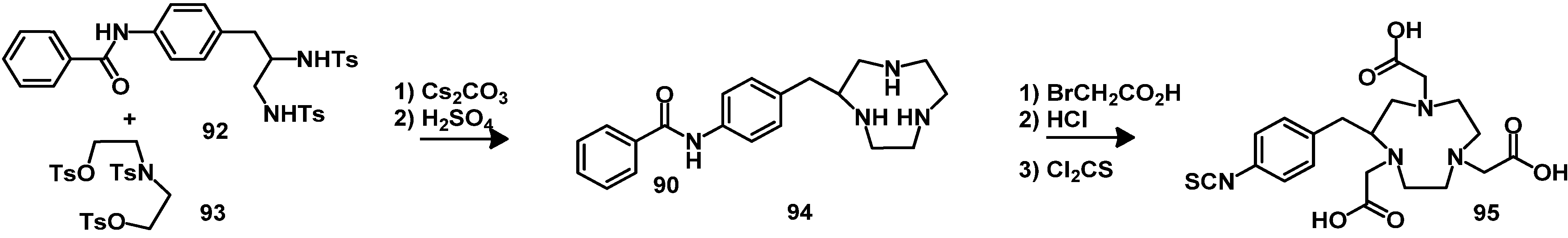 - McMurry, T.J.; Brechbiel, M.; Wu, C.; Gansow, O.A. Synthesis of 2-(p-thiocyanatobenzyl)-1,4,7-triazacyclononane-1,4,7-triacetic acid: Application of the 4-methoxy-2,3,6-trimethylbenzenesulfonamide protecting group in the synthesis of macrocyclic polyamines. Bioconjug. Chem. 1993, 4, 236–245. [Google Scholar] [CrossRef]