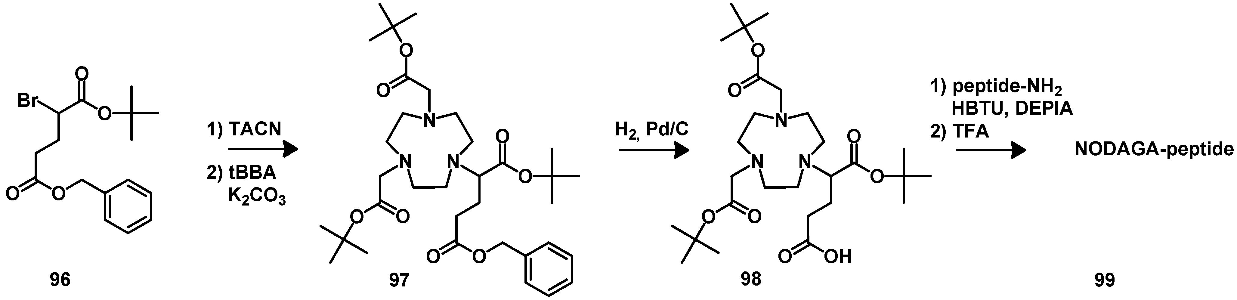 - Guerin, B.; Ait-Mohand, S.; Tremblay, M.C.; Dumulon-Perreault, V.; Fournier, P.; Benard, F. Total solid-phase synthesis of NOTA-functionalized peptides for PET imaging. Org. Lett. 2010, 12, 280–283. [Google Scholar] [CrossRef]