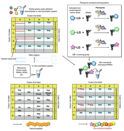 The cell-free (in vitro) translation approach is a more flexible and controllable system for the expression of such non-standard peptides. Even so, to achieve this goal it remains critical to develop appropriate tools for charging a wide array of non-proteinogenic amino acids onto tRNAs, making vacant codons in the genetic code, and then reassigning the non-proteinogenic amino acids with the non-proteinogenic aminoacyl-tRNAs. This strategy is referred to as genetic code “reprogramming”, as opposed to genetic code expansion.