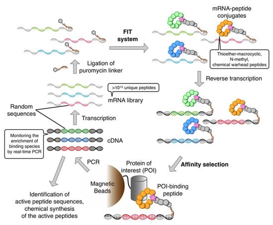 - Roberts, R.W.; Szostak, J.W. RNA-peptide fusions for the in vitro selection of peptides and proteins. Proc. Natl. Acad. Sci. USA 1997, 94, 12297–12302. [Google Scholar] [CrossRef]