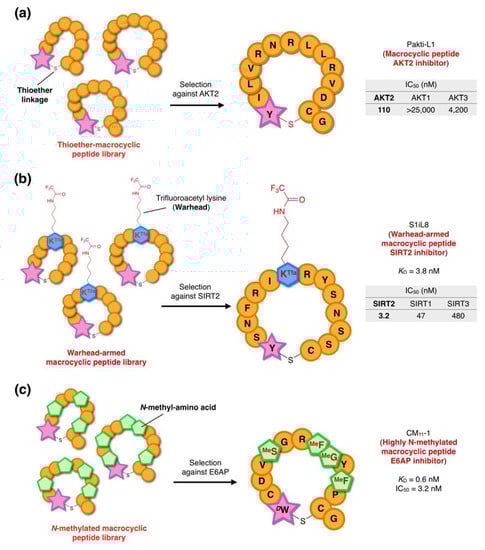 Selection of inhibitors from three distinct non-standard peptide libraries using the RaPID system. (a) Anti-AKT2 cyclic peptides. Thioether-macrocyclic peptide libraries were applied to the development of AKT2-selective inhibitors [60]. Pakti-L1 peptide exhibited AKT2-selective inhibitory activity with an IC50 of 110 nM. (b) Anti-SIRT2 peptides [64]. Thioether macrocyclic peptides armed with trifluoroacetyl Lys (KTfa), which acts as a warhead against the SIRT2 active site. The SIRT2-selective inhibitory peptide S1iL8 is shown, which demonstrated an IC50 of 3.2 nM. (c) Anti-E6AP peptides [65]. A library of N-methylated thioether macrocyclic peptide library was applied to the selection against E6AP to yield several active species, one of which CM11-1 exhibited an IC50 of 3.2 nM.