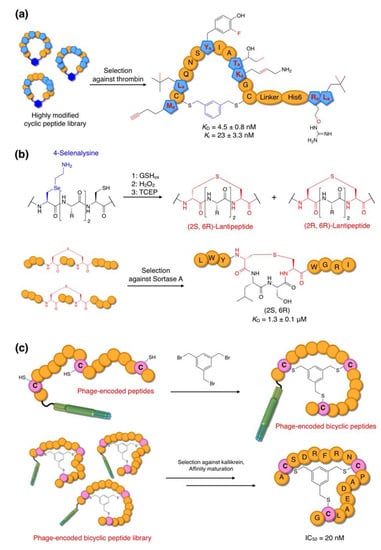 Other selection platforms. (a) Anti-thrombin cyclic peptides [70]. A library containing non-standard cyclic peptides containing up to 12 non-canonical amino acids was used for the selection of thrombin inhibitors. Macrocycles were formed by the reaction of two Cys residues with a bifunctional dibromoxylene linker. A selected active peptide contains six different non-canonical amino acids. (b) Anti-sortase A lantipeptide-like peptides [75]. An incorporated 4-selenalysine underwent elimination to dihydroalanine by H2O2 oxidation, and the lanthionine moiety was then formed by 1,4-addition of a Cys sulfhydryl group with dihydroalanine. (c) Anti-kallikrein “bicycle” peptides [76]. A library of peptides containing three spaced Cys residues was displayed on phage, and its treatment with TBMB yielded bicyclic peptides with six random amino acids in each loop.