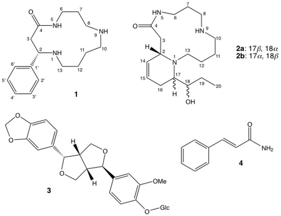 Compound 1, a yellow oil, had the molecular formula C16H25N3O as established by HR-ESIMS (m/z 276.2078 [M+H]+). The 16 carbon signals (Table 1) were identified with J-modulated 13C-NMR spectrum as eight sp3 methylenes, one sp3 methine, five sp2 methines and two sp2 quaternary carbons, including one amide carbonyl. The 1H-NMR and HSQC spectra displayed signals for three pairs of aliphatic methylene protons between δH 1.40 and 1.85, five pairs of deshielded methylene protons between δH 2.33 and 3.74, one deshielded methine (δH 4.01), and a monosubstituted benzene ring. These data were consistent with a 13-membered cyclic spermidine alkaloid bearing an aromatic ring. Analysis of COSY and HMBC spectra, measurement of a negative optical rotation ( = −13 (c 3.0, MeOH), and comparison with literature values indicated that Compound 1 was (–)-(2S)-2-phenyl-1,5,9-triazacyclotridecan-4-one [6]. Although this alkaloid has been used as a building block for the synthesis of other natural spermidine alkaloids [6,7,8], it is reported here for the first time as a natural product.