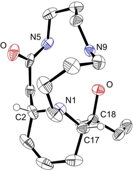 Compound 2a was obtained as colorless crystals (CH2Cl2). In the HR-ESIMS spectrum, it exhibited a quasi-molecular ion at m/z 310.2501 [M+H]+, establishing a molecular formula of C17H31N3O2. The molecular formula and the general framework of the 1H and 13C-NMR spectra (Table 2) indicated that compound 2a was also a macrocyclic lactam spermidine alkaloid. The J-modulated 13C-NMR and HSQC spectra displayed signals for an amide carbonyl carbon at δC 173.2, two methylenes adjacent to an amide function at δC 37.4 (CONH-CH2) and δC 41.9 (CH2-CONH), three nitrogenated CH2 (δC 45.8, 46.3 and 54.4), three methylenes (δC 22.2, 22.5 and 26.9) and one methine carbon at δC 56.5. These signals were consistent with a macrocyclic spermidine moiety and the partial structure was confirmed by analysis of the 1H-NMR spectroscopic data (Table 2), and COSY and HMBC correlations (Figure 2). Moreover, two additional methylene carbons (δC 20.5, 28.9), one methyl at δC 10.7, and four deshielded methine, including one oxygenated (δC 73.0) and two olefinic methines at δC 123.7 and 126.6, were observed. The 1H-NMR data and COSY correlations supported the presence of an ethyl moiety adjacent to an oxymethine and a double bond (δH 5.59, d, J = 10 Hz and 5.79–5.84, m). The connectivity between H-2/H-14, H-14/H-15, H-15/H2-16, H2-16/H-17, H-17/H-18, H-18/H2-19 and H2-19/H-20 was evident from COSY correlations suggesting that an unsaturated and hydroxylated chain was linked to the macrocyclic lactam through C-2. Further HMBC correlations revealed that C-17 was also connected through N-1 to the macrocyclic lactam (C-17/H-2 and C-17/2H-13). This was in accordance with the downfield chemical shift of C-17 (δC 63.5). The structure of 2a was finally confirmed by single-crystal X-ray diffraction (Figure 3). Moreover, owing to the presence of chloride atoms in the crystal, the absolute configurations of C-2, C-17 and C-18 were assigned as 2S, 17S and 18S using the refinement of the Flack parameter [9]. On the basis of the above findings and the measurement of a positive optical rotation = +12 (c 0.84, MeOH), the structure of 2a was unambiguously elucidated and the trivial name (+)-decaryine A was proposed. (+)-Decaryine A is different from palustrine previously isolated from Equisetum palustre [10,11] with respect to the orientation of the spermidine moiety in the macrocyclic lactam.