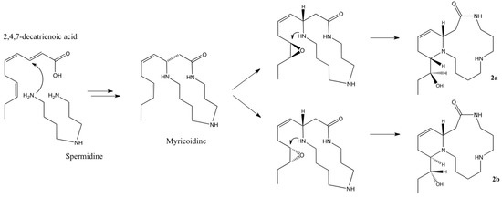 Compound 2b ( = −15 (c 0.13, MeOH)) was isolated as a yellow oil. The molecular formula was determined as C17H31N3O2 by HR-ESIMS (m/z 310.2497 [M+H]+). The 13C-NMR data (Table 2) in combination with analysis of HSQC and HMBC spectra revealed the presence of 17 carbons similar to those of compound 2. These data along with 1H-NMR data (Table 2) and extensive analysis of COSY and HMBC correlations suggested that compound 2b is a diastereoisomer of 2a. The relative and absolute configurations of C-2, C-17 and C-18 could not have been assessed by spectroscopic analyses. Nevertheless, considering the fact that all spermidine alkaloids, including those described here, exhibit the same three-dimensional orientation at C-2 [7,12,13,14,15,16,17,18,19], we can speculate that the latter carbon is (S)-configurated. Schultz et al. [12] suggested that the first step of the biogenesis of spermidine alkaloids involves an enzyme-catalyzed Michael addition that would lead to the same stereochemistry at C-2 (Scheme 1). They also proposed a potential biogenetic pathway for palustrine [13] that can be adapted to the alkaloids of A. decaryi (Scheme 1). Indeed, a Michael addition of the primary amine of the butyl unit of spermidine to the α,β double bond of 2,4,7-decatrienoic acid, followed by amidification of the second primary amine may give a first intermediate, an alkaloid named myricoidine. Epoxidation of the double bond in the 17,18-position would then allow a nucleophilic attack by the nitrogen atom N-1 of the secondary amine at C-17 that induce the inversion of C-17 stereochemistry, with a concomitant 6-membered ring closure and hydroxyl group formation at C-18. In that case, we can postulate that epoxidation may occur on both faces of the double bond. Epoxide ring opening could then yield both (2S, 17S, 18S) and (2S, 17R, 18R) diastereoisomers as depicted in Scheme 1. Detection of dihydromyricoidine [19] in crude alkaloidal extract by MS analysis (see Supplementary Material) and notable difference in chemical shift of C-17 (δC 63.5 and δC 57.0 for compound 2a and 2b, respectively) are in agreement with this hypothesis. Therefore, the configuration of compound 2b, named (–)-decaryine B, was proposed as 2S, 17R, 18R.