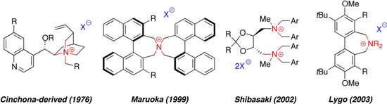 However, despite more than three decades of active research in this field it is somewhat surprising that besides the already mentioned privileged catalyst structures (Figure 1) only a few other classes of chiral ammonium salt PTCs have been reported so far [41,42,43,44,45]. Despite sometimes very exhaustive and careful structure-activity based investigations and optimizations [44,45], none of these other classes has so far reached the catalytic potential and application scope of especially the cinchona-based catalysts and the Maruoka-type catalysts.