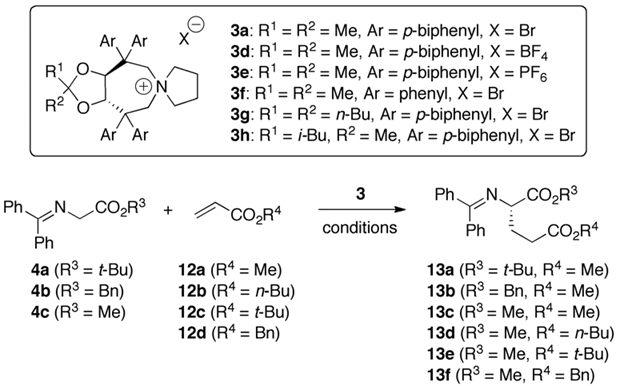 Asymmetric Michael addition of glycine Schiff bases 4 to acrylates 12 catalysed by TADDOL-derived ammonium salts 3.