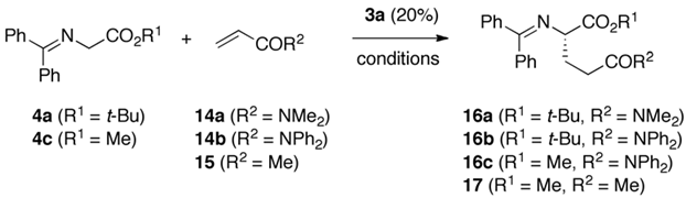 Having optimized the conditions for the asymmetric Michael addition of glycine Schiff bases 4 to acrylic acid esters 12 we then screened the use of other Michael acceptors like acrylamides 14 and methyl vinyl ketone (MVK, 15) (Table 2 gives a comprehensive overview about the results obtained with catalyst 3a). Use of acrylamides as acceptors in PT-catalysed Michael reactions has only sparingly been reported in the past [40,55] and, interestingly enough, these seemingly subtle changes in the Michael acceptor resulted in a totally different behaviour in our test reaction with glycine Schiff bases 4. Using the conditions that have been optimized for the addition to acrylates 12 first, we found that only small amounts of racemic product 16a could be obtained when reacting Schiff base 4a with the acrylamide 14a (entries 1 and 2). Also the use of other weaker solid bases did not give any product (entries 3 and 4 give just two examples of the tested ones) whereas the use of solid KOH (entry 5) gave a significant conversion, but almost no enantioselectivity (the same was observed using other solid hydroxide bases). Interestingly, when we used aqueous KOH, the product was obtained in reasonable yield and with a low enantiomeric ratio of 65:35 (entry 6). Similar results were obtained using other aqueous alkali hydroxide bases (entries 7 and 8) with RbOH being the best-suited one (e.r. 69:31 at 0 °C). Noteworthy, the observed tendency that aqueous hydroxide bases perform better than solid bases is in sharp contrast to our observations with the Michael additions to acrylates (Table 1) where aqueous bases clearly failed whereas solid ones performed superior. Further testing of different solvents and different conditions showed that for this reaction toluene is the superior solvent. Finally running the reaction for 2 days the product 16a was obtained in reasonable 65% yield and with a modest enantiomeric ratio of 75:25 (no further improvement was possible also due to the low reaction rate of this reaction at reduced temperature). Unfortunately, using the N,N-diphenyl acrylamide 14b as an acceptor the enantioselectivity dropped significantly again (entries 11 and 12) and testing secondary amides (not in the table) no product was formed, thus illustrating that Michael addition to acrylamides under asymmetric phase-transfer conditions is a rather challenging transformation. Using MVK as the acceptor both liquid/liquid and liquid/solid conditions gave the product, but the milder liquid/liquid conditions were found to be slightly better suited to give the Michael product 17 with a modest enantiomeric ratio of 77:23 (entry 14).