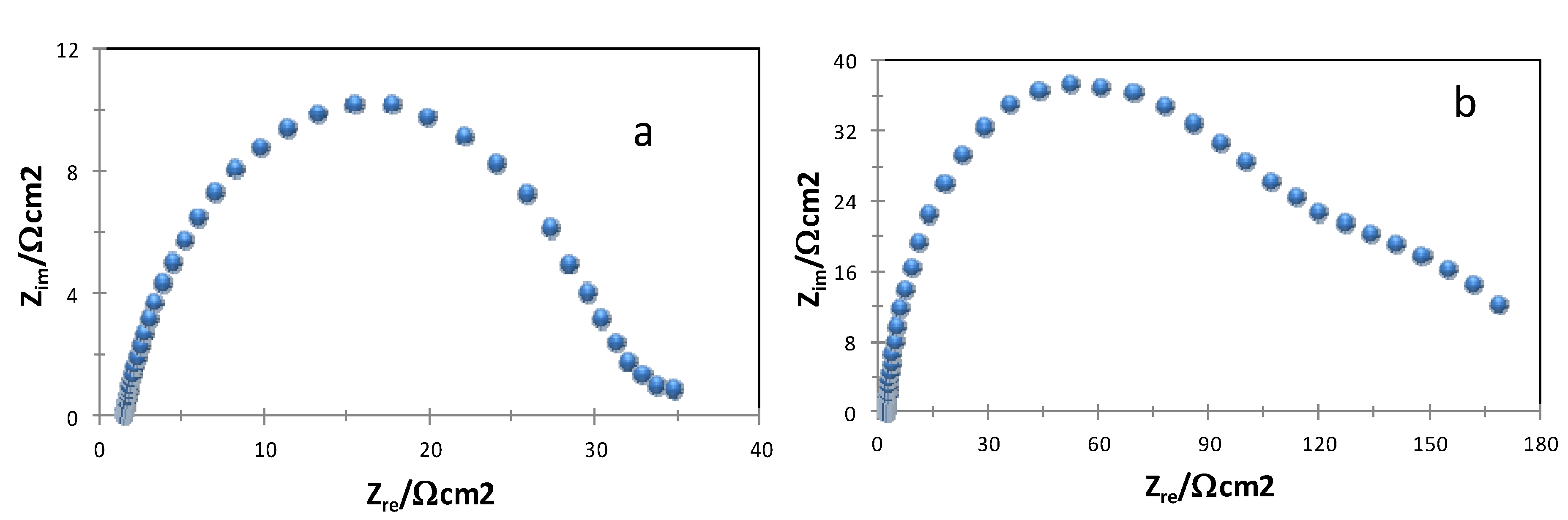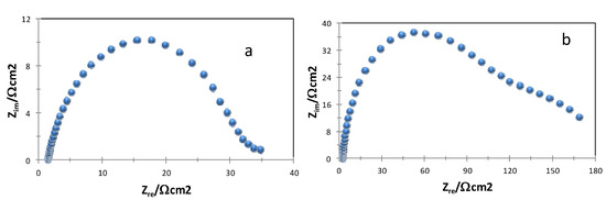 Experimental impedance data, Nyquist plots, recorded in the systems a) API 5L X52/1 M HCl and b) API 5L X52/1 M HCl + 25 ppm of compound 3.