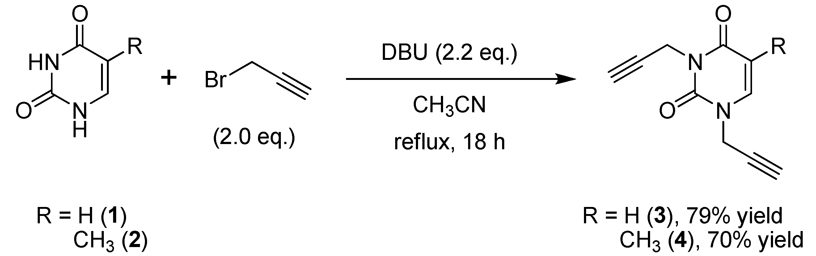 The dipropargyl uracil 3 was prepared from uracil (1) and propargyl bromide in the presence of DBU by refluxing the mixture in acetonitrile for 18 h. The TLC (CH2Cl2/MeOH 95:5 v/v) for the crude reaction mixture showed the formation of 3 (major product) and N-1-propargyluracil (minor product).