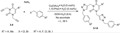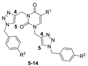The desired product 3 was obtained in 79% yield before purification by column chromatography (Scheme 1). These same conditions were used for the preparation of 4, which was obtained in 70% yield from thymine (Scheme 1). The second step of the synthesis was the preparation of 1,2,3-triazole nucleobases 5–14 through a Huisgen cycloaddition reaction between azides and the terminal alkynes. Based on the Fokin and Van der Eychen methodology [58], it was decided to carry out a multicomponent Cu(I)-catalyzed click reaction for the preparation of the compounds [59,60,61,62,63,64,65,66]. Initially, the reaction was tested by mixing dipropargyl uracil 3, benzyl chloride and sodium azide in the presence of triethylamine and a catalytic amount of Cu(I) iodide [67,68,69,70,71], and stirring at room temperature for 36 h, whereby compound 5 was obtained in 44% yield (Table 1, entry 1). When the reaction was repeated using Cu(OAc)2•H2O as precatalyst [72,73,74], sodium ascorbate as reducing agent, and 1,10-phenanthroline•H2O as ligand [67,75] in EtOH-H2O at room temperature, compound 5 was obtained in 74% yield (Table 1, entry 2). With these reaction conditions established, the remaining compounds 6–14 were prepared and obtained in good yields (Table 1, entries 3-11).