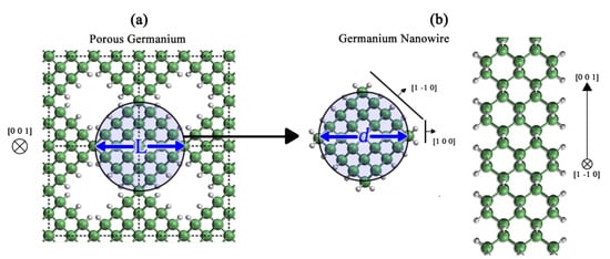 The nanostructures were modeled using the supercell technique [20,21]. In the case of the pGe, columns of Ge atoms were removed from an otherwise perfect Ge crystal along the [001] direction, taking special care that the pore conserved a rhombus shape. To study the effects of morphology and porosity on the vibrational properties of the pGe, the pores were modeled in two supercells: the first was an eight-atom cell with the lattice parameter of crystalline Ge (a = 5.65 Å), and the second was a thirty-two-atom supercell built by the union of four eight-atom cells. The porosity (p) in this case is defined as the ratio between the number of atoms removed and the total number of atoms in the original supercell, and the confinement distance is the diameter of a circle that encloses the Ge portion of the material and has the pore in its axis (L) (Figure 1a). For the nanowire in the [001] direction, the structures were created by removing the atoms that were outside of a circumference defined by a diameter d. In this case, the periodicity of the system is that of the crystalline Ge lattice parameter (c = 5.65 Å). The [001] direction was chosen because the pGe could be regarded as a collection of interconnected nanowires [13] at the percolation limit; the effect of said interconnection on the vibrational properties of these structures has yet to be studied.