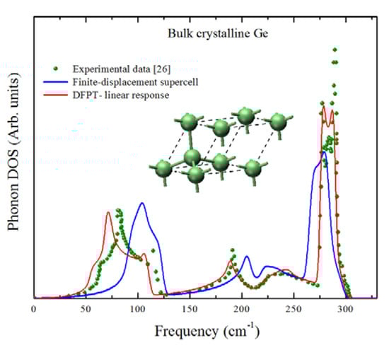 In Figure 2, we show the phonon density of states (DOS) of crystalline Ge calculated by using two algorithms: the finite displacement supercell scheme [29,30] and the density functional perturbation theory linear response approach [31,32], both calculation results are compared with the experimental data from reference [33]. The finite displacement results were obtained considering a force constant cutoff of 10 Å which, after a series of tests with increasing cutoffs, was chosen so the highest optical interval of the spectrum had the best fit possible regarding the peaks positions. It can be observed that, although both approaches yield results that are in reasonably good agreement with the experimental data especially near the highest optical mode (approximately 300 cm−1), the DFPT results have a better fit with the experimental results in the remaining portion of the spectrum. We thus decided to use the linear response approach for our calculations.
