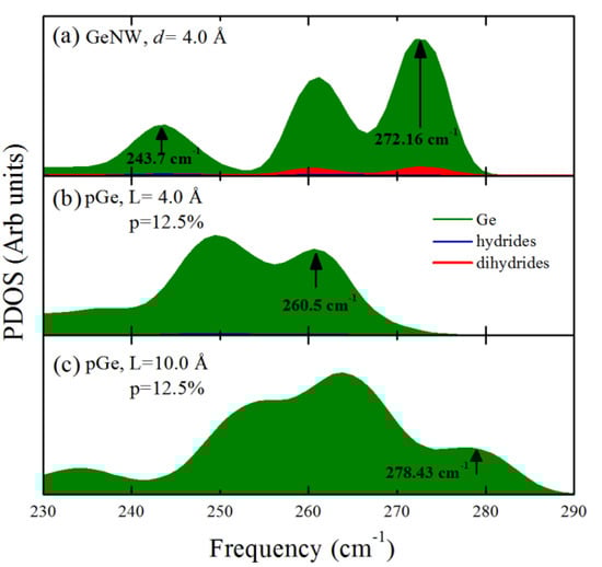 Once the phonon calculation scheme was selected, we calculated the partial phonon density of states (PDOS) of the nanowires and nanopores. In Figure 3, we show that the PDOS of (a) a GeNW with a diameter of 4.0 Å compared with (b) pGe with p = 12.5% and the same approximate confinement distance of 4.0 Å (L≈d). It can be observed that the expected behavior is not observed; a greater shift of the highest optical modes toward lower frequencies in the case of the nanowire compared with the porous case was expected since the nanowire has a total confinement along its cross section, while the porous case has only a partial confinement where the phonon wave functions are extended states but have extra nodes due to the pore presence, located at the pore boundary, these nodes determine the highest modulation of phonon wavelength, allowing only wavelengths smaller than L. Instead, we observed that there are higher optical modes in the nanowire compared with the porous case. It was postulated that the extra modes could be caused by the bending vibrations of the Ge-dihydride (H-Ge-H where the red area in Figure 3 represents the contribution of dihydride bonded hydrogen to the DOS) groups at the surface of the nanowires, such modes could mask the quantum confinement features in the nanowire and produce a greater shift in the porous case because this pore morphology avoids the presence of Ge-dihydride bonds in its surface. The frequency of these particular Ge-dihydride bending modes could be the result of a hybridization due to the proximity of such bonds since the corners of the nanowires are too close together. However, when compared with the highest frequency modes that exhibit no dihydride contribution, the shift in the nanowire (243.7 cm−1) is noticeably larger than the shift in the nanopore (260.5 cm−1). Along with the phonon confinement one important feature that modifies the behavior of the phonon DOS is the capillary stress due to the curved surfaces of the nanostructures, the large surface to core ratio increases the number of surface states compared to the core states as the nanowire diameter decreases, which reduces the optical frequency mode weight, these effects are accounted in [34]. To corroborate the nature of the observed effects, the 4.0 Å nanopore was compared with a nanopore with the same relative porosity but with a lower confinement distance (L = 10 Å). It can be observed that when the Ge-dihydride contributions are not present, the phonon confinement effects are more apparent because the highest optical modes in the 10 Å pore are less shifted (278.43 cm−1) compared with the 4.0 Å case (260.5 cm−1), which could also be explained in the surface states scheme as the surface to core ratio decreased thus decreasing the number of surface states. This result suggests that although the phonon confinement features always affect the vibrational properties of the nanostructures, the surface also contributes to a large extent to the vibrational properties near the highest optical modes. Furthermore, the presence of different types of bonds, even with the same element (in this case H), can substantially modify the phonon DOS of such structures.