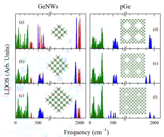To further investigate the differences between the Ge pores and nanowires with regard to their phonon spectrum, we studied the PDOS of three different nanowires compared with three diverse porosities; the results are summarized in Figure 4. To address the variation in the vibrational frequencies depending on the surface H bonds, we show a PDOS denoted by three areas: the green area represents the contribution of the Ge atoms, while the blue and red areas represents the contribution of single hydride H, and dihydride H (H atoms of H-Ge-H bonds) to the DOS respectively. In the nanowires case it can be observed that in the energy range between 300 and 500 cm−1, there is a red area that decreases its width while the nanowire diameter increases, which correspond to bending vibrational modes in the Ge-dihydrides. The gradual narrowing of this area is due to the lower number of dihydride bonds relative to single hydride bonds, also due to the lower hybridization between dihydride phonon modes as the nanowire corners are separated when the diameter increases. This feature allows for a clearer phonon confinement signature on the larger diameter nanowires compared with the smaller ones since the shift of the highest optical modes to lower frequencies is not masked by the dihydride vibrations. A second region can be observed in the nanowire case (at approximately 500 to 750 cm−1), which is comprised of dihydride and hydride vibrations and no contribution from the Ge; this region consists of bending modes. As the hydride/dihydride ratio increases, the hydrogen bending region becomes mostly dominated by single hydride vibrations, which can be expected due to the large number of single hydrides. Finally, a fourth region can be identified (around 2000 cm−1), which is composed of stretching vibrations of single hydrides and dihydrides. It can be observed that even when the nanowire diameter increases the single hydride and dihydride contributions are clearly distinguished, which could be important to the characterization of such nanowires with the different spectroscopy techniques. As for the nanopore case, only three regions could be identified (expected due to the absence of the dihydrides at the surface): the Ge dominated vibration region (0 to 300 cm−1), the single hydride bending interval (400 to 750 cm−1), and the H stretching (2000 cm−1) modes. It is important to note that the results shown in Figure 4c,d have the same relationship as those depicted in Figure 3a,b but with L≈d of 8 Å. When comparing the Ge contribution (0–300 cm−1) in the cases of Figure 4c,d the effects of the dihydrides are reduced due to the increased concentrations of Ge-hydride bonds, hence greater shift of the highest optical modes in the case of the nanowire was observed, according to quantum confinement scheme. Other possible explanation of the decreased contribution of the dihydrides to the DOS around 300 cm−1 in the 8 Å NW case, could be due to the separation between the dihydrides. In the lower diameter NWs the corners are too close hence a phonon hybridization could take place, thus shifting to lower energies the dihydride rocking modes (normally at 500 cm−1 for Ge dihydride bonds [35]); as the nanowire diameter increases these modes become less hybridized shifting to their normal interval of frequencies (400 to 500 cm−1). Regardless the dihydride behavior it can be observed that when comparing this set of nanowires with nanopores in a 32 atom supercell; the effect of the phonon confinement is observed since the last highest optical modes with Ge contribution of the GeNW were shifted to a lower frequency compared with that of the pGe.