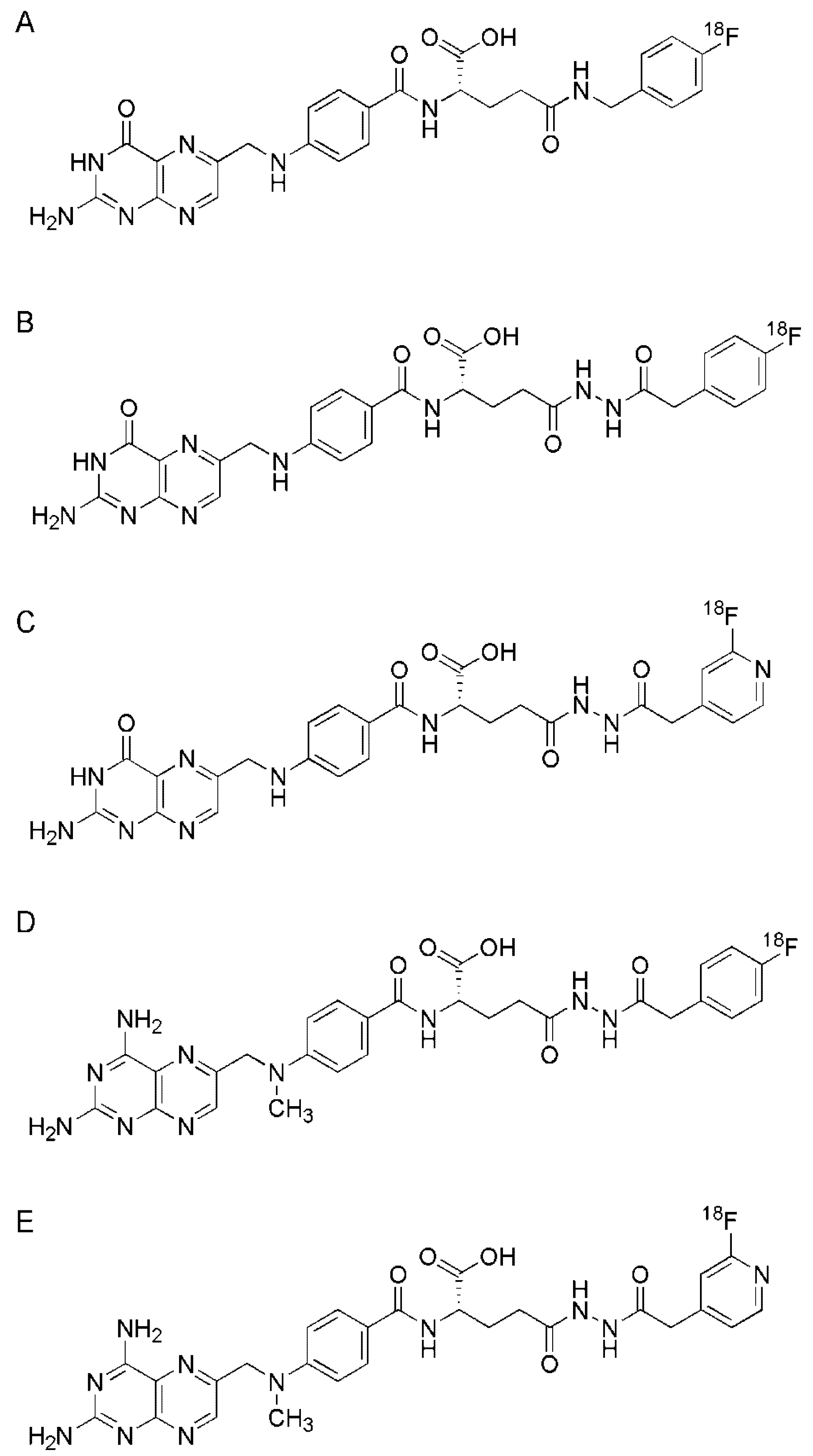 (A) Chemical structures of [18F]FBA-γ-folate [63], (B) [18F]fluoro-benzene-carbohydrazide-folates, (C) [18F]fluoro-pyridine-carbohydrazide-folate [63], (D) [18F]fluoro-pyridine-carbohydrazide-methotrexate [67] and (E) [18F]fluoro-pyridine-carbohydrazide-methotrexate [67].