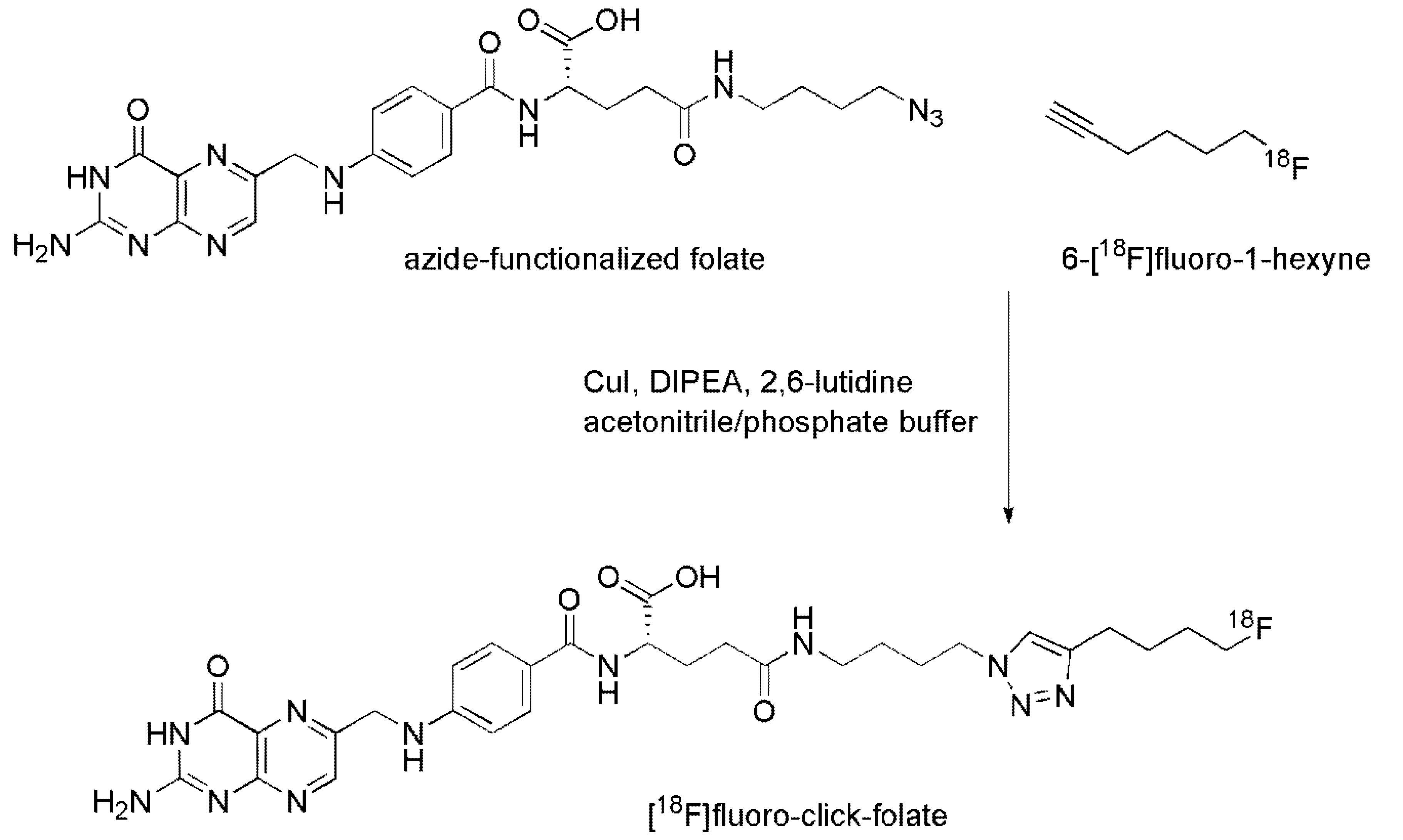 Ross et al., developed a folic acid conjugate in which 6-[18F]fluoro-1-hexyne was used as a radioactive prosthetic group for coupling via the Cu(I)-catalyzed 1,3-dipolar cycloaddition [69,70] to an azide-derivatized folate precursor (Figure 3) [43]. 6-[18F]fluoro-1-hexyne was synthesized starting from the corresponding p-tosylate precursor according to a previously published procedure [71].