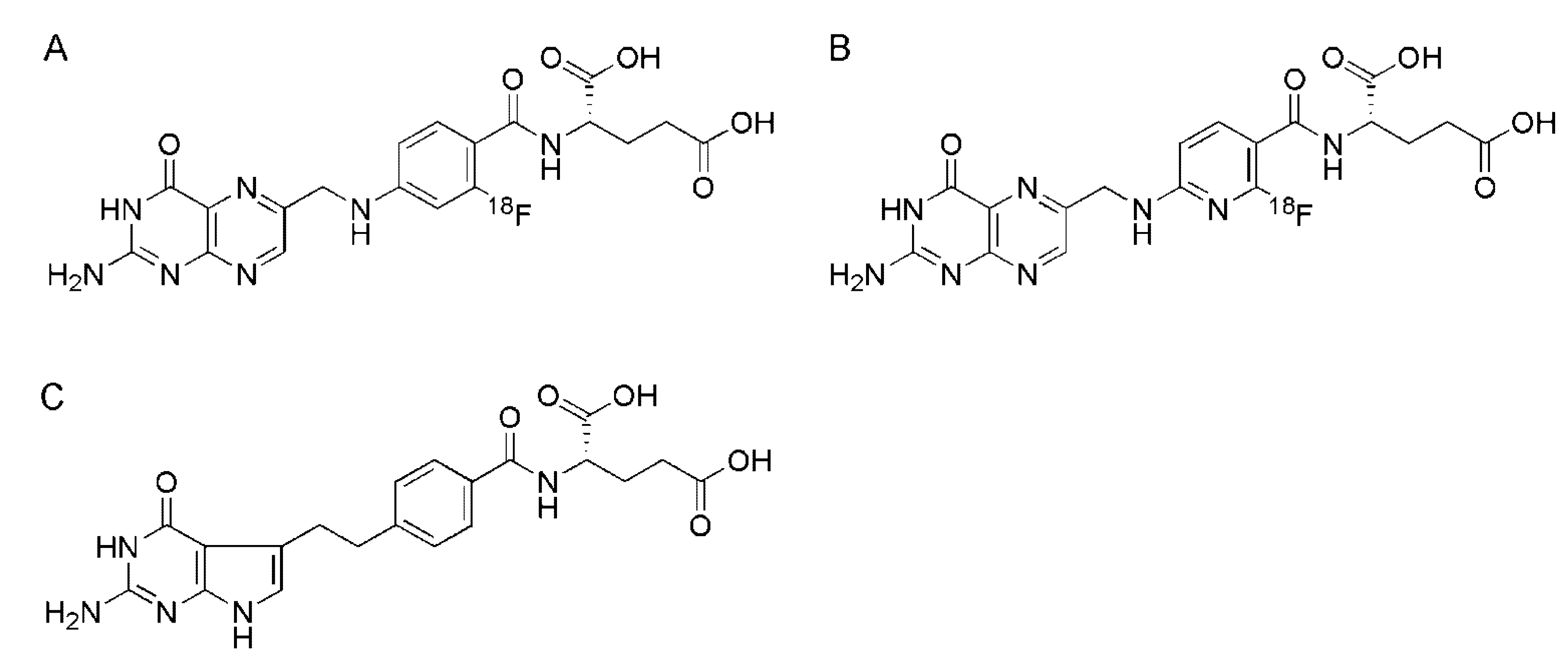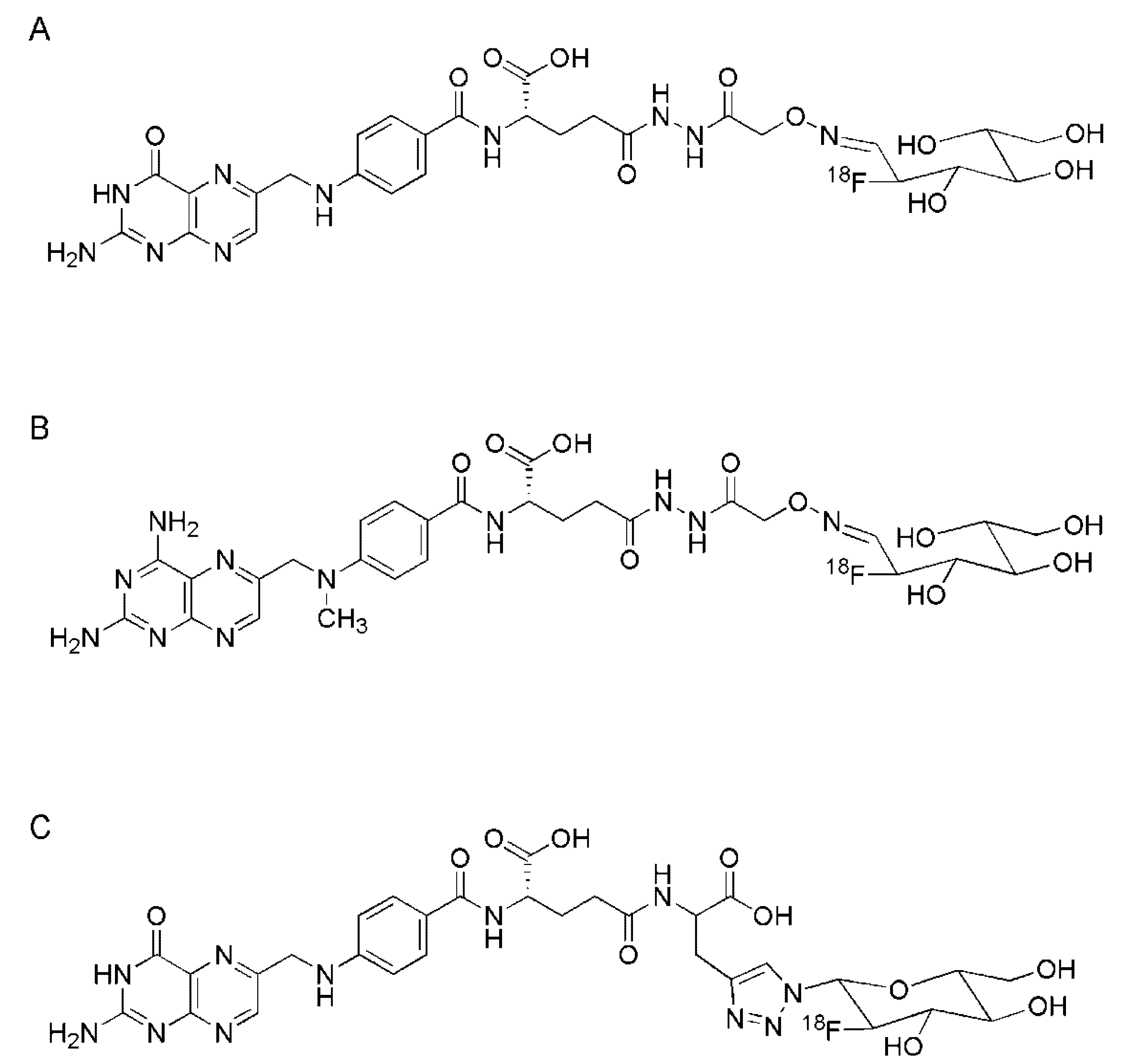 (A) Chemical structures of [18F]FDG-folate [74], (B) [18F]FDG-methotrexate [74] and (C) [18F]fluoro-deoxy-glucose-folate [45].