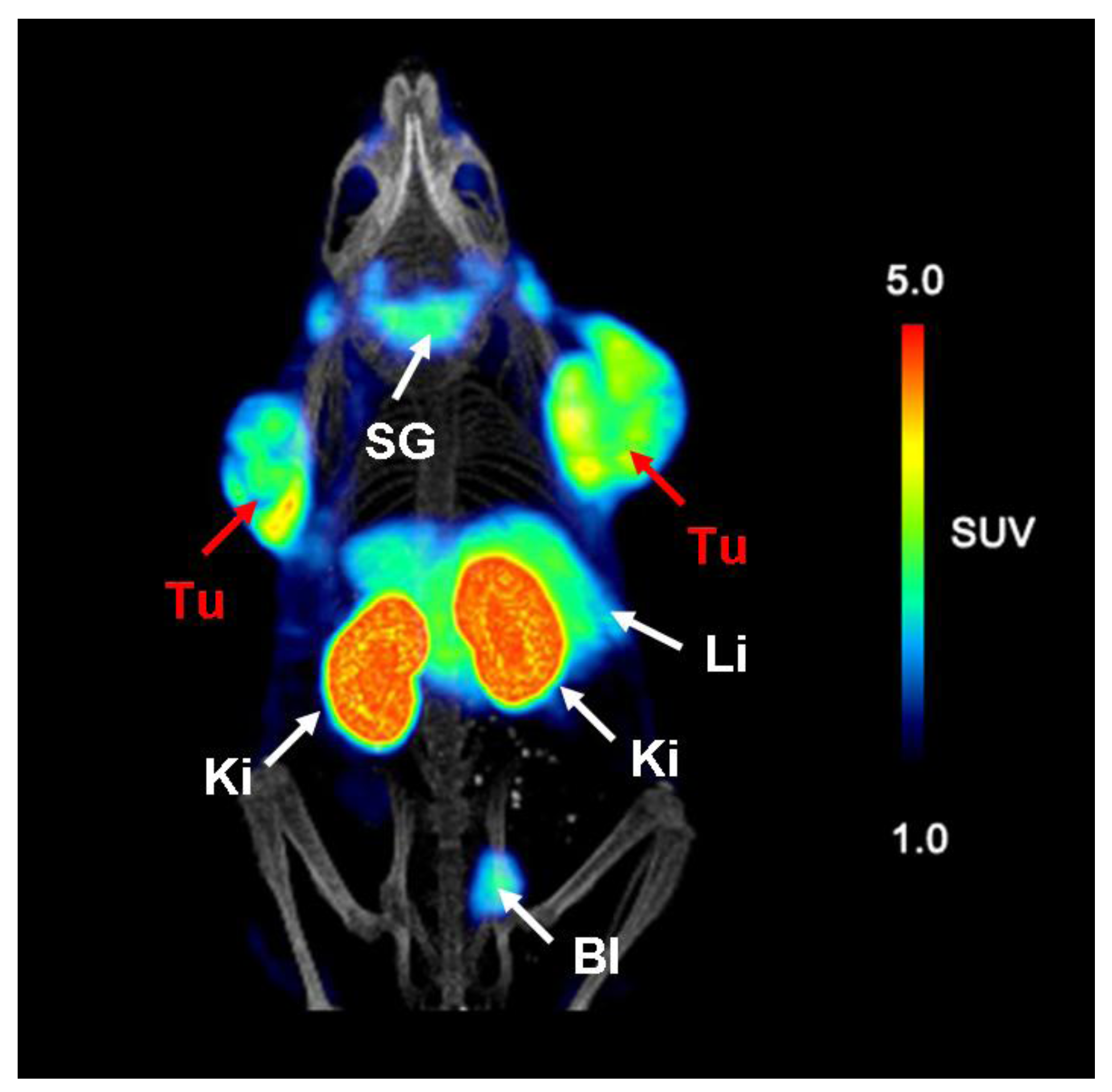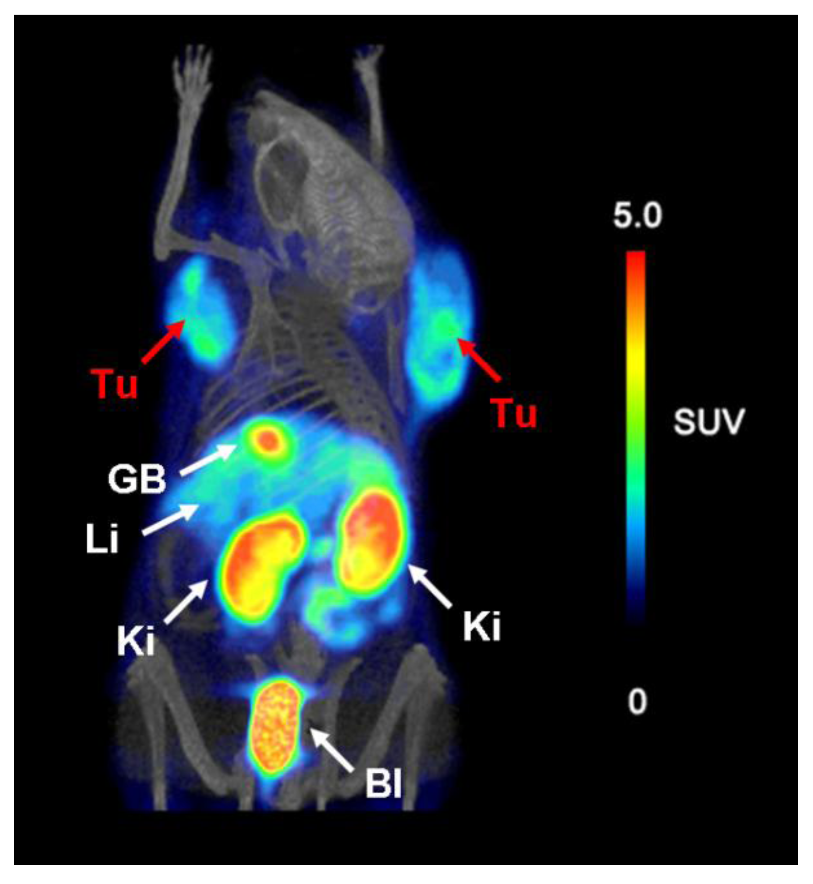 PET/CT image of a mouse 75 min after injection of [18F]fluoro-deoxy-glucose-folate (~14 MBq) [45]. (Tu = KB tumor xenograft, GB = gall bladder, Li = liver, Ki = kidney, Bl = urinary bladder). Reprinted (adapted) with permission from Fischer et al. [45] Copyright (2012) American Chemical Society.