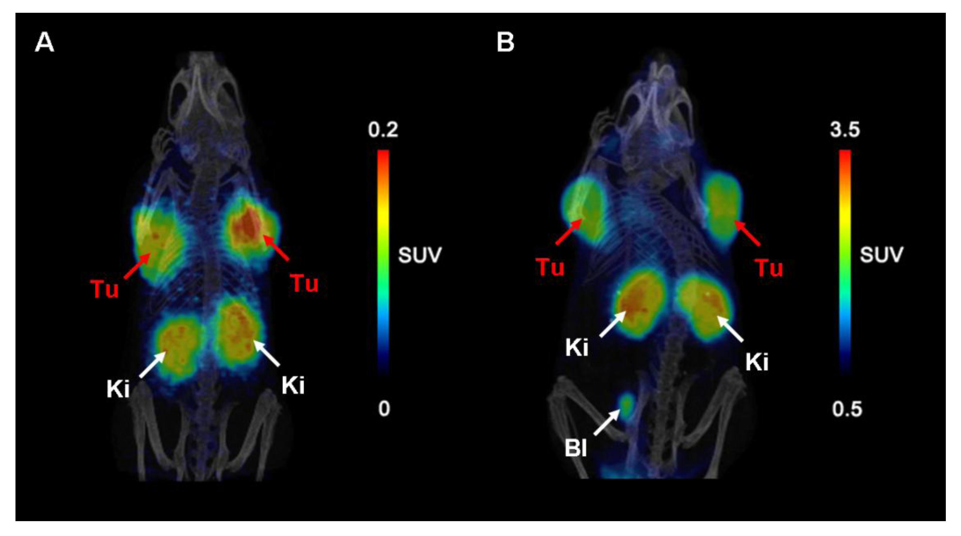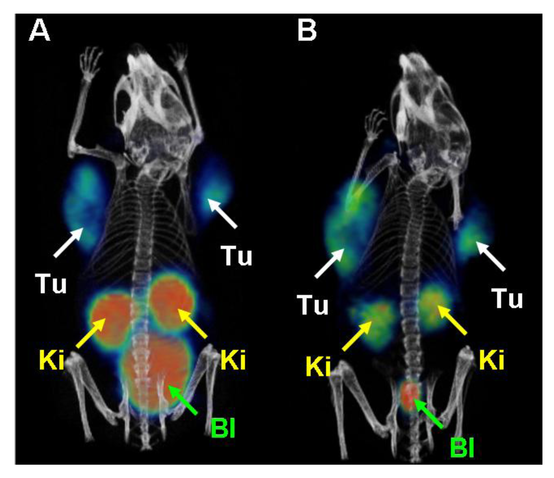 PET/CT images of KB tumor bearing mice. (A) Mouse injected with 68Ga-EC0800 (~25 MBq) 1.5 h before scanning and (B) mouse which received pemetrexed (0.4 mg) prior to 68Ga-EC0800 (~18 MBq). (Tu = KB tumor xenograft, Ki = kidney, Bl = urinary bladder). Reprinted (adapted) with permission from Müller et al. [6]. Copyright (2013) Bentham Science Publishers.
