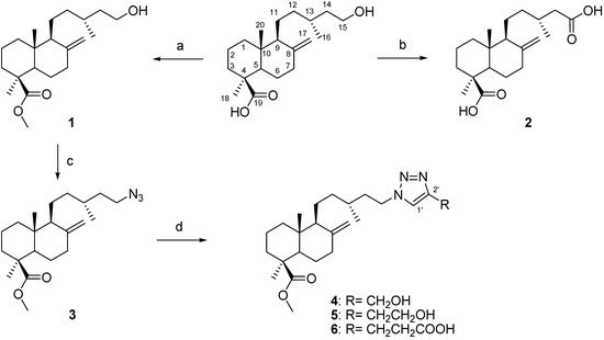 Melting points were determined on a Koffler hot stage apparatus (Electrothermal 9100, Dubuque, IA, USA) and were uncorrected. Optical rotations were measured on a Jasco DIP 370 (Jasco Analytical Instruments, Easton, MD, USA) polarimeter in CHCl3 at 20 °C. IR spectra were recorded on a Nicolet Nexus 470 FT-IR instrument (Thermo Electron Corporation, Whaltham, MA, USA). The NMR spectra were recorded on a Bruker Avance 400 (Bruker, Rheinstetten, Germany) spectrometer at 400 MHz for 1H and 100 MHz for 13C in CDCl3. Chemical shifts are given in ppm with TMS as the internal standard. High-resolution mass spectra were measured on a VG Micromass ZAB-2F at 70 eV (Varian Inc., Palo Alto, CA, USA). Merck silica gel (0.063–0.2) was used for column chromatography, pre-coated Si gel plates (Merck, Kieselgel 60 F254, 0.25 mm) were used for TLC analysis. TLC spots were visualized by spraying the chromatograms with p-anisaldehyde-ethanol-acetic acid-H2SO4 (2:170:20:10 v/v) and heating at 110 °C for 3 min. Dicyclohexylcarbodiimide (DCC) and dimethylaminopyridine (DMAP) were from Merck (Germany). 4-Toluenesulfonyl chloride (TsCl) from Fluka (St. Louis, MO, USA), propargyl alcohol, 3-butyn-1-ol and 4-pentynoic acid were from Aldrich (Streinheim, Germany). 1,4-dibromobutane, 1,5-dibromopentane and 1,9-dibromononane were from Aldrich (St. Louis, MO, USA). Sodium azide (Sigma-Aldrich, St. Louis, MO, USA), copper (II) sulphatepentahydrate (Aldrich, St. Louis, MO, USA) and sodium ascorbate (Sigma, St. Louis, MO, USA). The diterpene15-hydroxy-labd-8(17)-en-19-oic acid (imbricatolic acid) was isolated from the resin of Araucaria araucana as previously described [17,22]. To obtain the starting compound for the synthesis, imbricatolic acid was methylated with diazomethane to afford compound 1. Compound 2 was obtained from imbricatolic acid by oxidation with Jones reagent (CrO3/H2SO4/H2O).