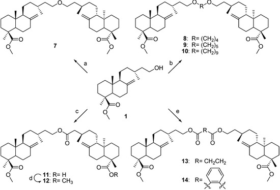 Starting from the naturally occurring diterpene imbricatolic acid, fourteen dimers were synthesized using different linkers. The diterpene imbricatolic acid, used as starting compound for the synthesis was isolated from the resin of Araucaria araucana. Imbricatolic acid was methylated with diazomethane to form compound 1. 15-Hydroxyimbricatolic acid was treated with the Jones reagent (CrO3/H2SO4/H2O) to afford the diacid junicedric acid (JA, 2). Compound 1 was tosylated and then treated with NaN3 in DMF to form the azide 3. Compounds 4–6 were prepared by “click chemistry” of 3 with different alkynes using CuSO4·5H2O/sodium ascorbate in t-BuOH/H2O (Scheme 1).