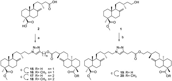 The dimers 15, 17 and 19 were prepared by “click chemistry”. To prepare the dimers 15 and 17, JA (2) was treated with DCC/DMAP in dry CH2Cl2 and different alkyne alcohols (propargyl alcohol and 3-butyn-1-ol), to afford the corresponding alkynes esters. These esters were treated whit the azide 3 and CuSO4·5H2O/sodium ascorbate in t-BuOH/H2O to yield the desired products. In the same way 19 was obtained treated imbricatolic acid with DCC/DMAP in dry CH2Cl2 and 4-pentynoic acid, the ester obtained was then treated with the azide 3 (Scheme 3). All the C-19 methyl esters were prepared by reaction with a diazomethane solution (compounds 12, 16, 18 and 20). In all, some 19 compounds were prepared starting from the diterpenes labd-8(17)-en-15-hydroxy-19-oic acid (imbricatolic acid) and labd-8(17)-en-15,19-dioic acid (junicedric acid, compound 2). The new compounds include ethers and esters with different “linkers” (spacers) as well as 1,2,3-triazole-substituted derivatives prepared by click chemistry.