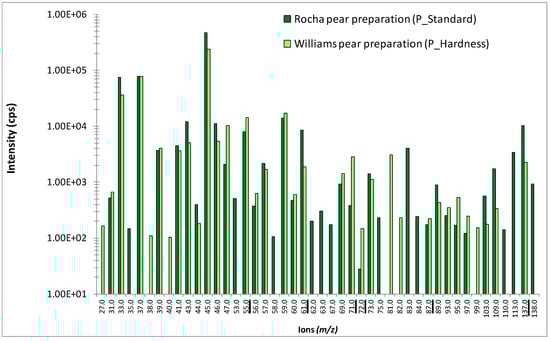 Figure 1 presents PTR-MS spectra obtained during in vitro measurements in the headspace above Rocha and Williams pear preparations. Many fragments were common to the two pear varieties (28 out of 46), and the highest peaks presented a similar intensity for both Rocha and Williams pear preparations (m/z 33, m/z 43, m/z 45, m/z 46, m/z 55 and m/z 87). However, some ions were specific to the Rocha pear preparation or released with the highest intensity from this preparation (for example, fragments m/z 53, m/z 61, m/z 83, m/z 113 and m/z 137), whereas others were specific to the Williams pear variety or released with the highest intensity from this last preparation (for example, fragments m/z 27, m/z 71, m/z 72 and m/z 81).