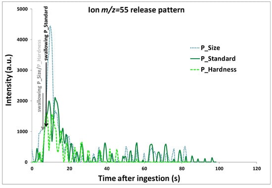 Release kinetics for ion m/z 55, corresponding mainly to cis-3-hexenyl butyrate, obtained by in vivo PTR-MS measurement with one panelist during the consumption of the three yogurts, P_Standard, P_Size and P_Hardness. The PTR-MS instrument drift tube was thermally controlled (60 °C) and operated with voltage and pressure set at 600.1 (± 0.4) V and 1.9 (± 0.06) mbar, respectively. Time 0 corresponds to the time of product introduction in the mouth.