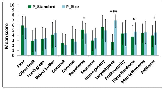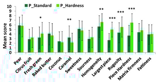 Significant differences in aroma perception were highlighted by the panel between P_Standard and P_Hardness (with the hardest pear pieces) yogurts (Figure 4): P_Hardness yogurt was perceived as having a more intense “green” note and less intense "caramel" note than P_Standard yogurt. No significant taste difference was observed between these two yogurts. Regarding texture perception, pear pieces in P_Hardness yogurt were perceived as being significantly harder, rougher, larger and more homogeneous than pear pieces in P_Standard yogurt.