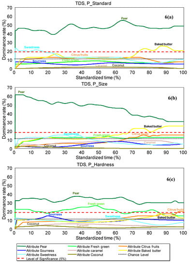 TDS curves for each product were constructed with the panel dominance rate (%) calculated per product for each attribute and at each point in time, as described by Pineau et al. [10]. The end of the curve represents the time at which perception ends (Tend). In order to compare products, TDS curves were also determined using a standardized time scale, from 0% (beginning of consumption) to 100% (end of perception), as described in the literature [45].