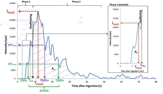 For data handling, release curves were divided into three main periods (Figure 7): the phase before the product was put in the mouth (0), the oral phase of consumption before swallowing (1), and the phase after swallowing (2). For each sample, the mean PTR-MS signal measured during phase 0 was subtracted from the PTR-MS signals obtained during the product consumption phases. The following release variables were extracted from each individual release curve and for each phase of product consumption using a software program developed by the laboratory: maximum intensities reached during phases (1) and (2) of in-nose analyses (Imax1 and Imax2), times necessary to reach Imax1 and Imax2 (Tmax1 and Tmax2), taking starting time (T0) as the moment when the spoonful of yogurt was introduced into the mouth, and areas under the curve (A1 and A2). Times necessary to reach 20% of Imax before and after Tmax (T20%- and T20%+) and times necessary to reach 50% of Imax after Tmax (T50%+) were also recorded. They represent the in-mouth release rate and release persistence, respectively. Parameter △T20% was calculated as the time difference between T20%− and T20%+ and represents the peak width. The time that elapsed between yogurt introduction into the mouth and swallowing (TSW) was also recorded. All these parameters were subjected to a two-way analysis of variance (ANOVA) with interactions (product, panelist) to determine significant differences between the products and the panelists.