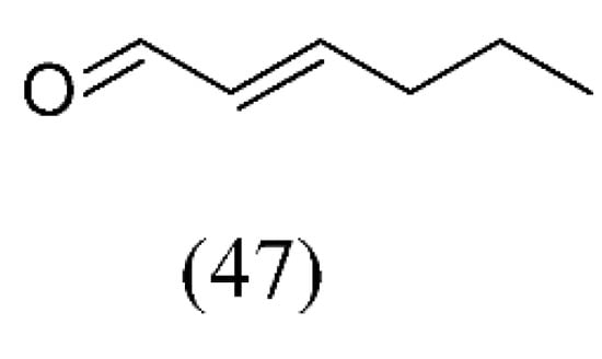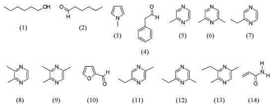 | Arachis hypogaea | roasted peanuts | hexanol (1), hexanal (2), methylpyrrole (3), phenyl acetaldehyde (4), methylpyrazine (5), 2,6-dimethylpyrazine (6), ethylpyrazine (7), 2,3-dimethylpyrazine (8), 2,3,5-trimethylpyrazine (9), 2-furancarboxaldehyde (10), 2-ethyl-5-methyl- (11) and 2-ethyl-6-methylpyrazine (12), and 3-ethyl-2,5-dimethyl-pyrazine (13) | None | [39] |