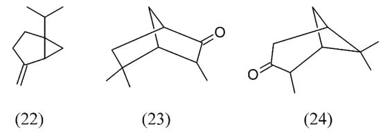| Hyssopus officinalis | hyssop | sabinene (22), iso-pinocamphone (23) and pinocamphone (24) | Methanol | [53] |