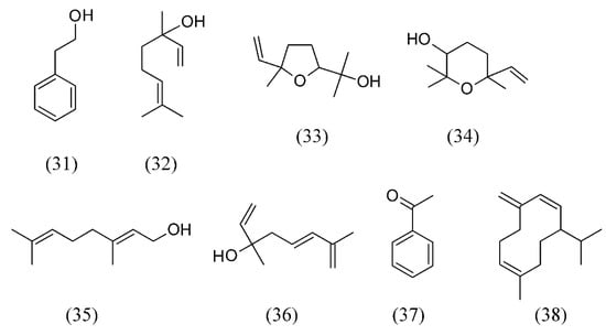 | Camellia sinensis | tea flowers | phenylethanol (31), linalool (32), (E)-linalool oxide furanoid (33), epoxy linalool (34), geraniol (35), hotrienol (36), acetophenone (37) and germacrene D (38) | None | [62] |