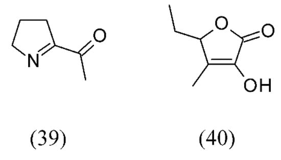 | Pandanus amaryllifolius | pandan leaves | 2-acetyl-1-pyrroline (ACPY) (39) and 3-methyl-2(5H)-furanone (40) | None | [63] |