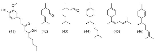 | Zingiber officinale | ginger | gingerol (41), neral (42), geranial (43), zingiberene (44), α-bisabolene (45) and β-sesquiphellandrene (46) | None | [64,65] |