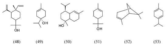 | Abies koreana | needle leaves | elemol (48), terpinen-4-ol (49), sabinene (22), 10(15)-cadinen-4-ol (50), α-terpineol (51), α-pinene (52) and γ-terpinene (53) | None | [73] |