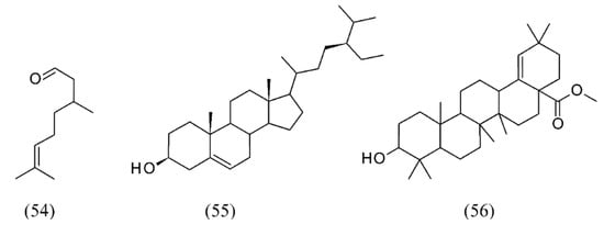 | Eucalyptus citriodora | leaves | citronellal (54) | None | [75] |