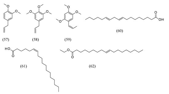 | Polygala senega, Acorus Tatarinowii | mixture of herbs | methyl eugenol (57), 1,2,3-trimethoxy-5-(2-propenyl)-benzene (58), β-asarone (59), (Z,Z)-9,12-octadecadienoic acid (60), (Z)-6-octadecenoic acid (61), and ethyl oleate (62) | None | [77] |