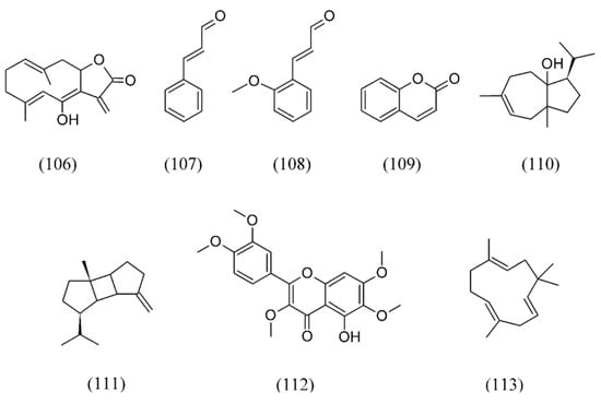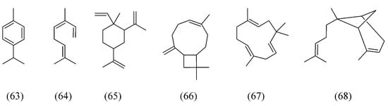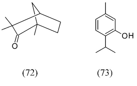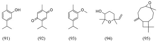 | Thymus vulgaris | thyme | p-cymene (63), γ-terpinene (53), linalool (32), thymol (73), carvacrol (91), thymoquinone (92), carvacrol methyl ether (93), camphor (81), cis-linalool oxide (94) | None | [101,102,103] |