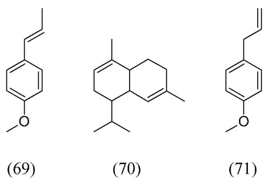 | Foeniculum vulgare | fennel seeds | (E)-anethole (69), estragole (71), and fenchone (72) | None | [103] |