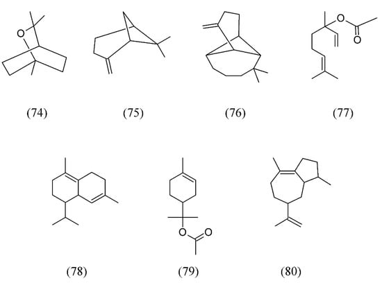 | Laurus nobilis | bay laurel | (E)-β-ocimene (64), 1,8-cineole (74), α-pinene (52), β-pinene (75), β-longipinene (76), linalyl acetate (77), δ-cadinene (78), α-terpinyl acetate (79) and α-bulnesene (80) | None | [82] |