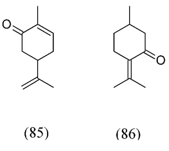 | Mentha spicata | spearmint | carvone (85), 1,8-cineole (74), pulegone (86) | None | [89,90] |